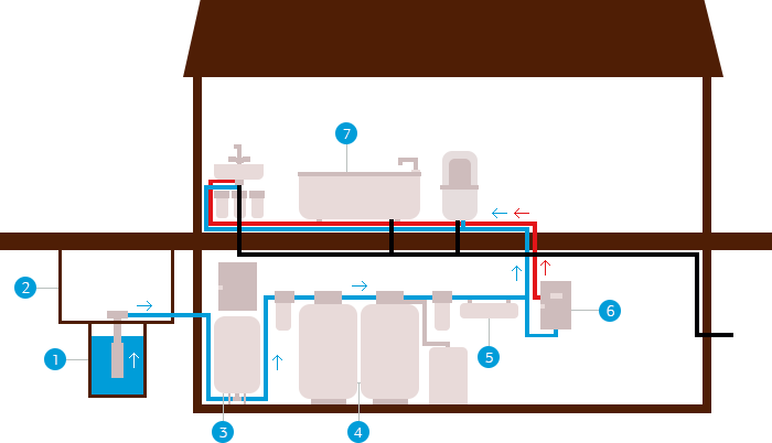Автономная система водоснабжения представляет собой независимую коммуникацию, которая обеспечивает поступление воды в дом. Устанавливается она там, где отсутствует возможность подключиться к системе централизованной подачи воды. Как правило, это дома за чертой города. Автономное водоснабжение загородного дома представляет собой систему, состоящую из следующих элементов: