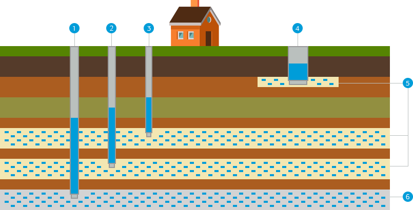 • Артезианская скважина (на известняк) является лучшим решением для водоснабжения загородного дома. Забор воды в ней происходит из известнякового водоносного слоя, который в зависимости от месторасположения может залегать на глубине достигающей нескольких сотен метров. Вода в этом слое находится под давлением, поэтому статический уровень воды меньше чем глубина самой скважины. Из артезианской скважины можно получать более 10 м3/ч воды, чего достаточно для водоснабжения даже нескольких коттеджей. Вода в большинстве случаев не нуждается в доочистке и пригодна для питья, так как от поверхностных вод ее защищают водонепроницаемые слои грунта. Срок службы артезианской скважины составляет 15-30 лет, и как правило, в процессе эксплуатации с ней не возникает никаких проблем. Над скважиной устанавливается металлический герметичный колодец – кессон, для защиты от грунтовых вод и легкого обслуживания скважины.