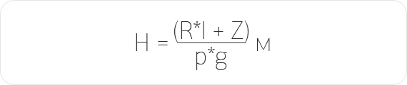 Кроме необходимой подачи, насос должен обеспечивать в системе отопления напор (Н), достаточный для преодоления сопротивления трубопроводной сети. Для правильного выбора нужно определить потери в наиболее протяженной линии схемы (до самого дальнего радиатора). При проектировании новой системы возможны точные расчеты с учетом сопротивления всех элементов (труб, фитингов, арматуры и отопительных приборов). Обычно необходимые сведения приводятся в паспортах на оборудование. При точном расчете можно использовать формулу: