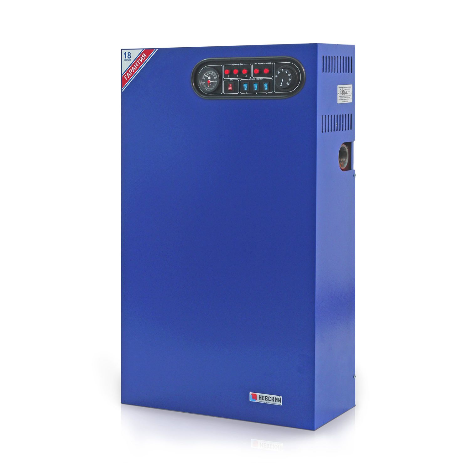Монтируется на стене, занимает мало места и не требует отдельного помещения для размещения, имеет встроенный термоманометр. Котел имеет каскадное включение ступеней, контролирует наличие теплоносителя, входное напряжение, имеется возможность подключения дополнительного реле протока и термостата-программатора.